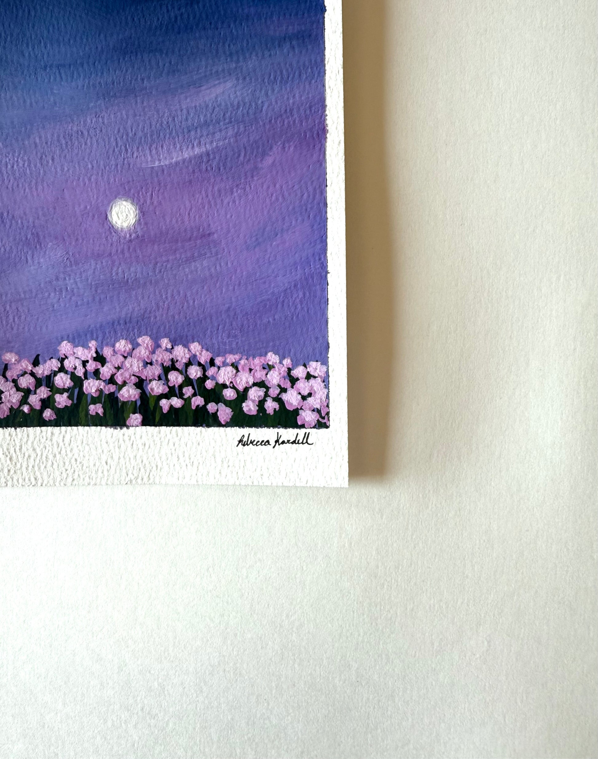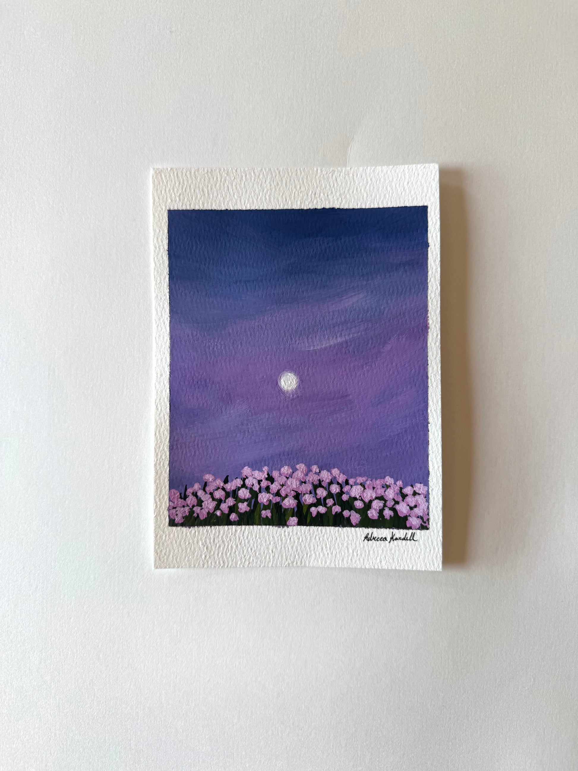 Gouache on watercolor paper, is 5x7 inches. Signed on the front. This painting comes unframed. Gouache paintings should be kept under a glass frame to keep them safe.